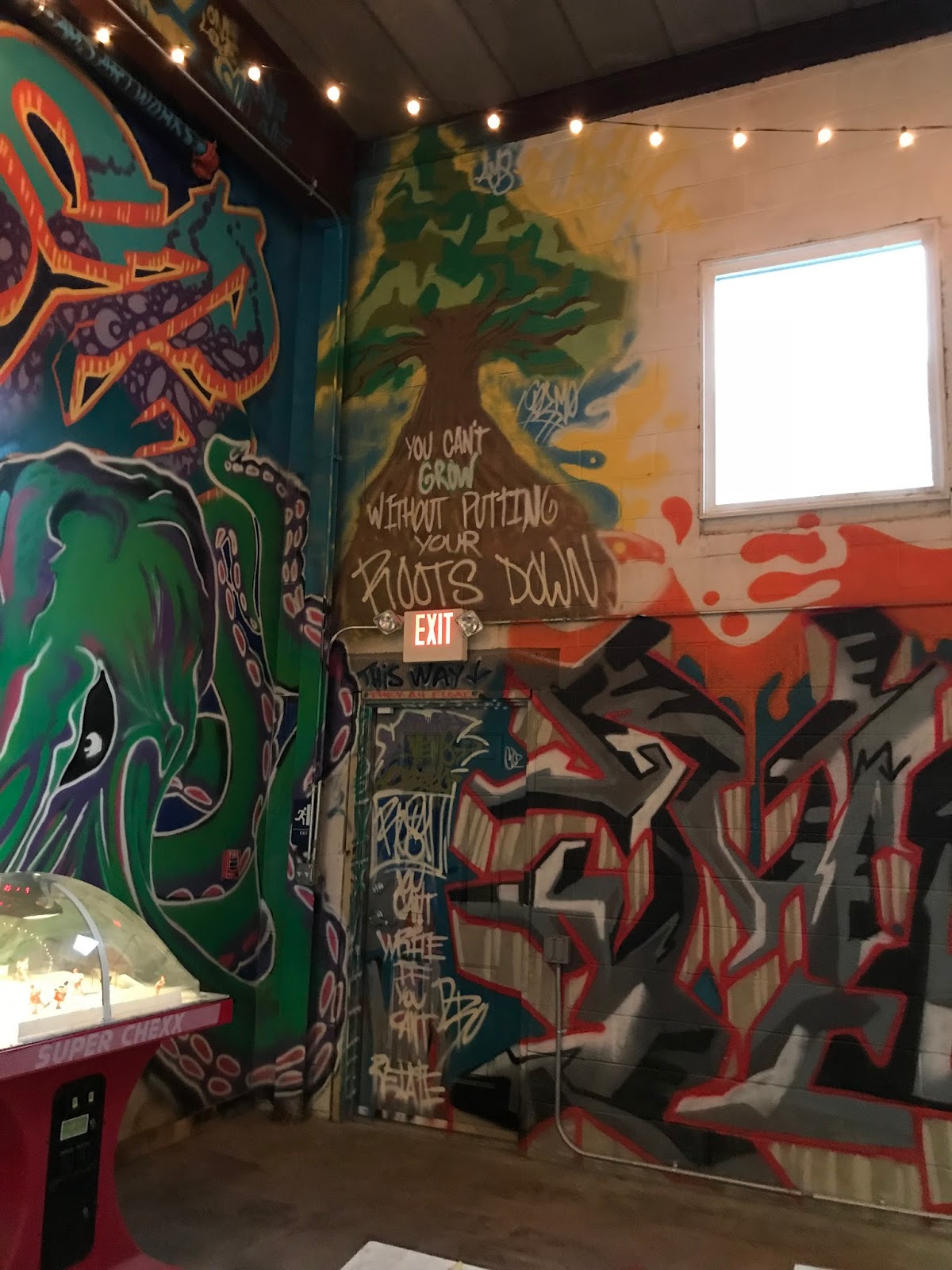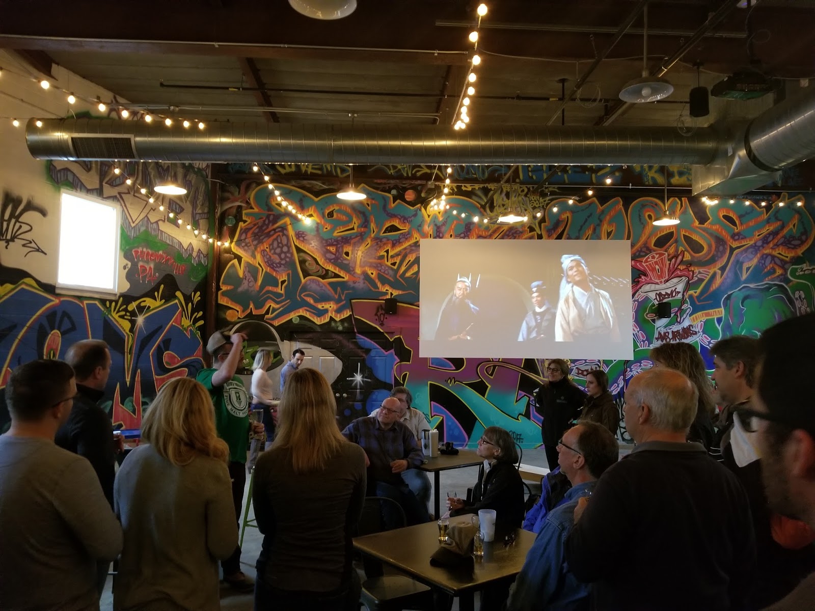 Our final stop was Root Down Brewing Co. in Phoenixville, a brewery that was conveniently located directly across from the Phoenixville Foundry, where we’d all parked our cars.  This was such an intriguing spot to end our tour. A former root beer factory, the building retains its industrial, warehouse feel with wide open spaces that allow for games, a movie, graffiti art, and ample seating for the crowds who were enjoying the food and beer before our tour arrived. In addition to the beer tastings, we were treated to a presentation on Phoenixville’s history by local historian Ryan Conroy.